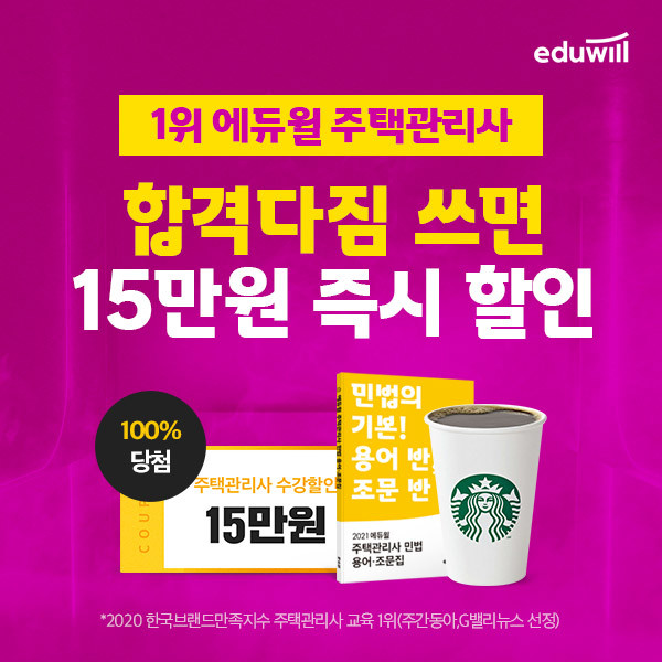 또한, 에듀윌 주택관리사 ‘합격원정대’를 SNS 또는 주택관리사 커뮤니티에 공유한다면 선착순 20명에게 스타벅스 아메리카노 커피를 증정한다.