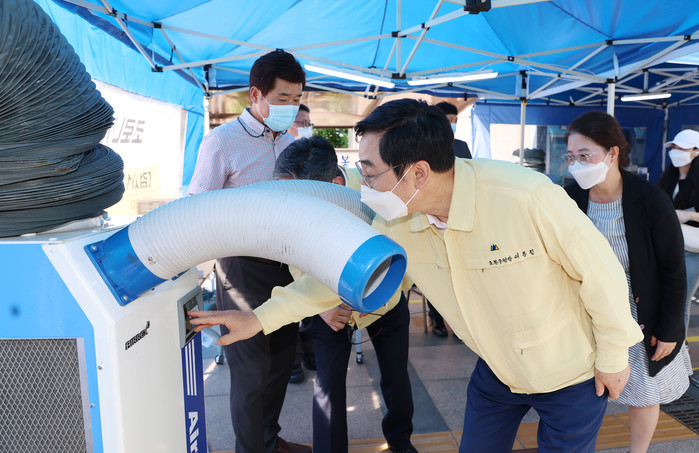 이동진 도봉구청장은 지난 16일 창동역 1번 출구 임시선별검사소, 도봉구민회관 임시선별검사소 2곳과 도봉구보건소의 선별진료소 1곳을 찾아 야외에서 폭염으로 고생하는 의료진과 직원들의 고충을 듣고 격려했다. 사진은 이 구청장(가운데)이 도봉구보건소 선별진료소에 설치된 냉풍기를 살펴보고 있는 모습. (사진제공=도봉구청)