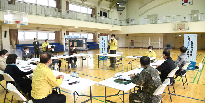 노원구가 지난 9일 코로나19 백신 예방접종 지역협의체 첫 회의를 개최했다. 이날 회의에서는 시·군·구 백신 예방접종계획을 공유하고, 백신접종 관련 의료 및 지원인력 구성 및 운영방안 등을 논의하고 지역접종센터 대상지 현장을 점검했다. 사진은 오승록 구청장(가운데) 및 관계자들이 회의를 하고 있는 모습. (사진제공=노원구청)