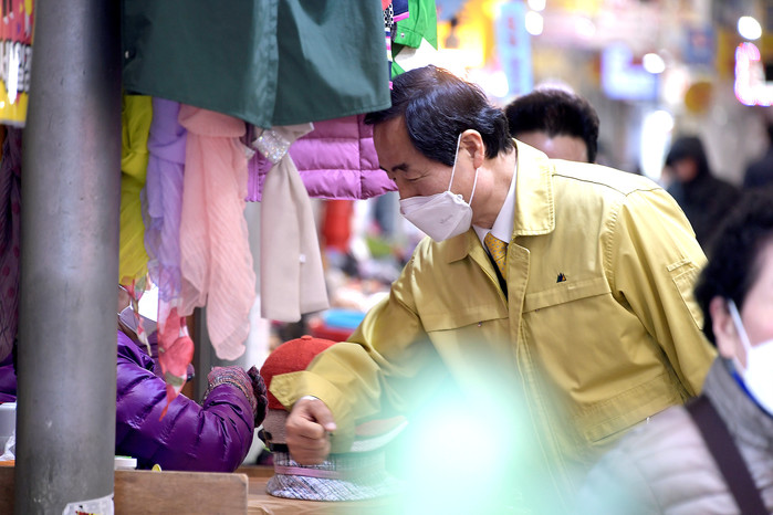 문석진 서울 서대문구청장이 4일 천연동 영천시장을 방문해 '코로나19' 방역실태 등을 점검하고 압축분무기와 약품 등의 방역물품을 전달했다. 사진은 문 구청장이 시장의 한 상인과 악수 대신 팔등을 마주치며 인사를 나누는 모습. (사진제공=서대문구청)