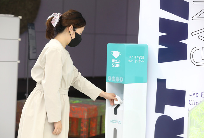 서울 강남구는 전국 지자체 최초로 구청 및 보건소, 22개 동주민센터에 마스크 전용 수거함 ‘마스크 모아통’을 설치해 사용된 마스크의 올바른 배출을 유도하고 있다. 사진은 한 주민이 최근 사용한 마스크를 수거함에 넣고있는 모습. (사진제공=강남구청)