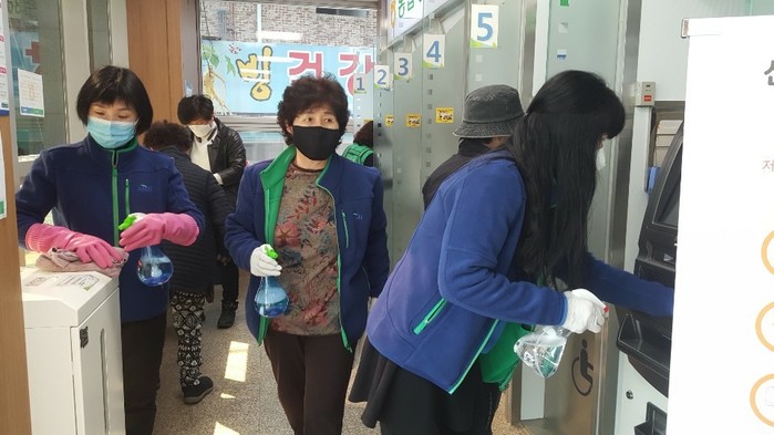 경기 포천시 영중면 새마을지도자협의회와 새마을부녀회는 25일 코로나19 확산 방지를 위해 면사무소, 농협, 우체국, 어린이집 등 다중이용시설을 중심으로 합동방역 및 캠페인을 했다. 사진은 농협에서 소독작업을 하고 있는 모습. (사진제공=포천시청)