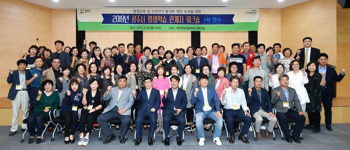 경기 광주시가 최근 광주하남상공회의소에서 주민자치위원을 대상으로 '2019년 광주시 평생학습 관계자 워크숍'을 개최했다. 이번 워크숍은 지역내 평생교육 및 주민자치 활성화 방안 모색을 위해 마련됐다. 사진은 신동헌 시장과 위원들의 기념촬영 모습. (사진제공=광주시청)