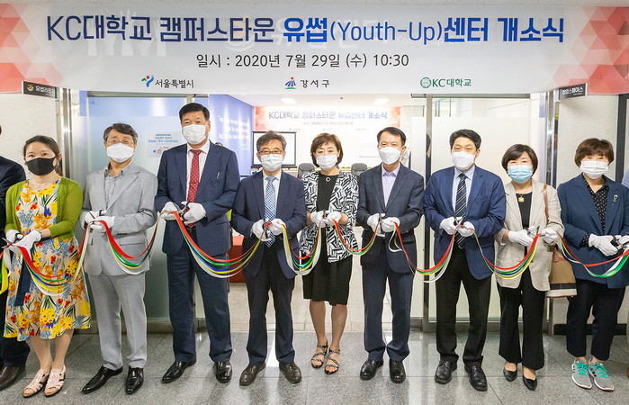 서울 강서구와 KC대학교는 최근 양 기관 관계자들이 참석한 가운데 지역내 2곳의 청년창업 지원 공간 개소식을 하고 본격 운영을 알렸다. 사진은 등촌중학교 등마루관 1층에 조성된 'Youth-Up 센터'에서 관계자들이 테이프커팅을 하는 모습. (사진제공=강서구청)