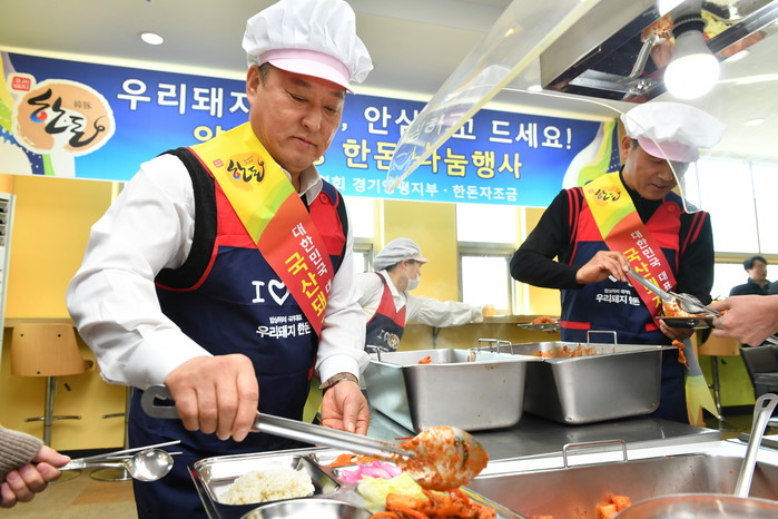 경기 양평군이 아프리카돼지열병으로 위축된 돼지고기 소비촉진을 위해 최근 군청 구내식당에서 소비촉진 행사를 열었다. 이날 행사에는 정동균 군수, 이종인 의원 등이 참여해 직원들에게 돼지고기볶음을 배식했다. 사진은 정 군수(왼쪽)가 배식하는 모습. (사진제공=양평군청)