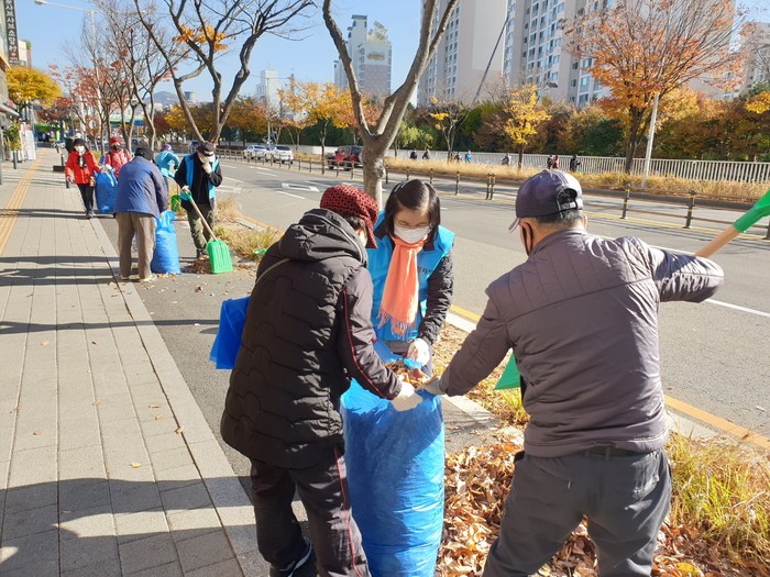 경기 수원시 장안구 정자3동은 ‘수원 희망 6000 일자리사업’ 참여자들과 함께 4일 지역내 주요 도로변과 인도에 쌓여 있는 낙엽을 집중 수거했다. 사진은 이날 참여자들이 낙엽을 수거하고 있는 모습. (사진제공=수원시청)
