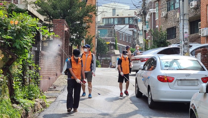 경기 수원시 장안구 율천동은 최근 지역내 코로나19 확진자 발생에 따라 집중적인 방역을 실시했다. 사진은 단체장협의회와 주민자치회 회원 등이 참여해 지역내 유동인구가 많은 곳을 중심으로 방역활동을 하는 모습. (사진제공=장안구청)