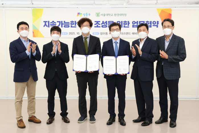 서울 성동구는 최근 서울대학교 환경대학원과 지속가능한 도시 조성을 위한 업무협약을 체결했다. 이번 협약은 지속가능한 도시 조성에 대해 양기관이 비전과 사업을 공유하고 발전시키는 내용으로 진행됐다. 사진은 협약식에서 정원오 구청장(오른쪽 세 번째)과 관계자들이 기념촬영을 하는 모습. (사진제공=성동구청)