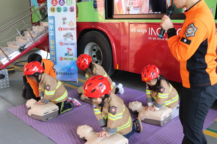 인천송도소방서가 22일 본서 차고에서 지역내 한국119소년단인 송명초등학교 병설유치원 단원 및 지도교사 30여명을 대상으로 소방안전체험교실을 열고 올바른 119 신고 방법, 심폐소생술 등을 교육했다. 사진은 심폐소생술 실습을 하는 아이들의 모습. (사진제공=송도소방서)