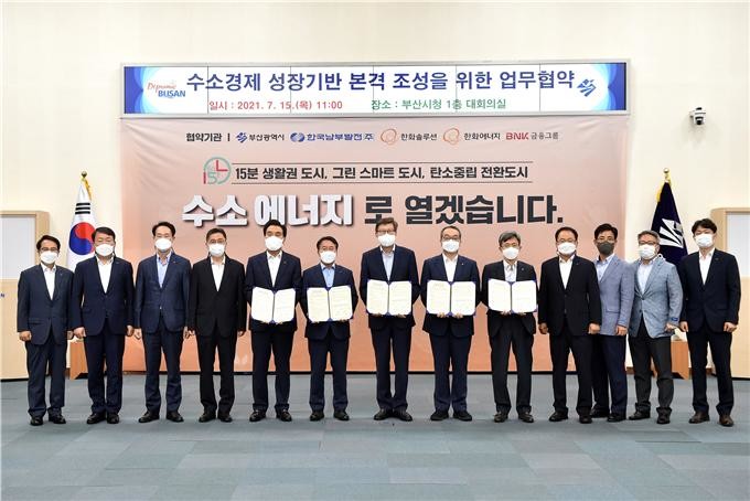 부산시(시장 박형준)는 7월 15일 오전 11시 시청 1층 대회의실에서 한국남부발전, 한화솔루션, 한화에너지, BNK금융그룹과 ‘탄소중립 전환도시 실현을 위한 수소경제 성장기반 조성 업무협약(MOU)’을 체결했다고 밝혔다.