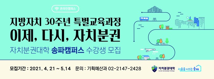[시민일보 = 이대우 기자] 서울 송파구(구청장 박성수)가 지방자치 부활 30주년과 함께 지방자치 2.0시대를 맞아 지역리더 양성을 위한 '자치분권대학 온라인 캠퍼스'를 개설한다.