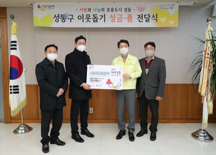 서울 성동구는 지난 15일 (사)서울시옥외광고협회 성동구지부로부터 500만원의 이웃돕기 성금을 전달받았다. 이번 후원 행사는 2021 희망온돌 따뜻한 겨울나기의 일환으로 추진됐다. 사진은 전달식에서 정원오 구청장(오른쪽에서 두 번째)이 관계자들과 기념촬영을 하는 모습. (사진제공=성동구청)