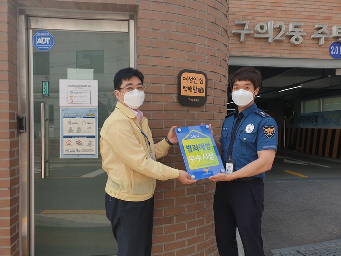 | ▲ 광진경찰서 관계자가 구의2동 주택가 공동주차장에 ‘범죄예방 우수시설 인증패’를 전달하고 있다. (사진제공=광진구청) |