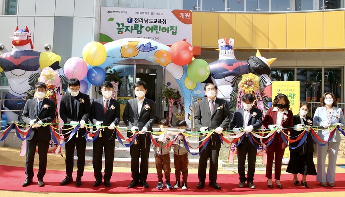 전라남도교육청 직장보육시설인 꿈자람어린이집이 31일 개원식을 개최했다. 어린이집은 지상 2층 906㎡ 규모로, 최신 트렌드를 반영한 공간혁신을 통해 6개 보육실·유희실 등을 갖췄다. 사진은 개원식에서 장석웅 교육감(왼쪽 네 번째)이 관계자들과 테이프 커팅을 하고 있는 모습. (사진제공=전라남도교육청)