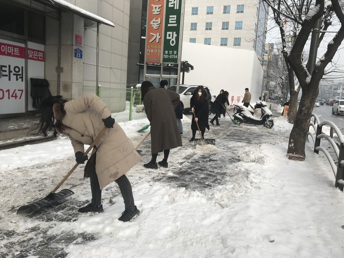 경기 광주시가 12일 내린 눈으로 인한 시민 불편을 최소화하기 위해 전공무원과 유관기관 및 민간단체, 시민들이 참여해 제설작업에 나섰다. 사진은 주요 도심지역의 인도에서 제설작업을 하는 모습. (사진제공=광주시청)