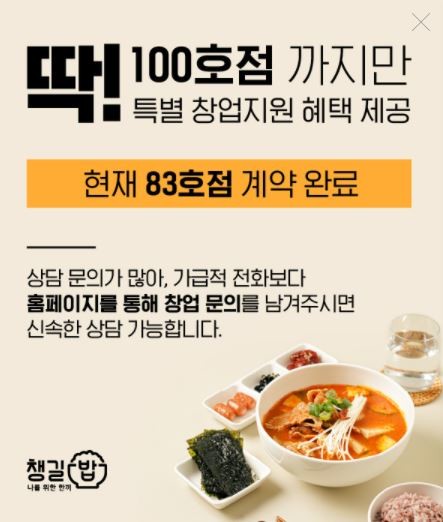 한편 한식배달 프랜차이즈창업 브랜드 ‘챙길밥’은 선착순 100호점 한정 특별 창업 혜택을 선보이고 있다. 이 브랜드는 가맹점주와의 상생을 원칙으로 가맹비, 교육비, 로열티, 보증금 등을 폭넓게 할인하는 혜택을 지원 중이다. 현재 83호점까지 오픈한 상태로 100호점 한정 특별 창업 혜택 지원 마감이 임박하여 예비창업자들의 많은 문의가 이어지고 있다는 게 업체 측 설명이다. 자세한 내용은 챙길밥 공식 홈페이지를 통해 확인 가능하다.