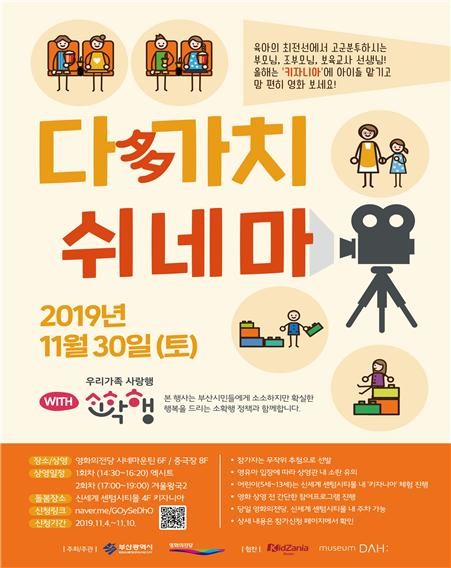 부산시(시장 오거돈)는 오는 11월 30일, 영화의전당에서 육아의 최전선에서 고군분투하는 부모·조부모·보육교사를 위한 ‘다多가치쉬네마’를 개최한다.