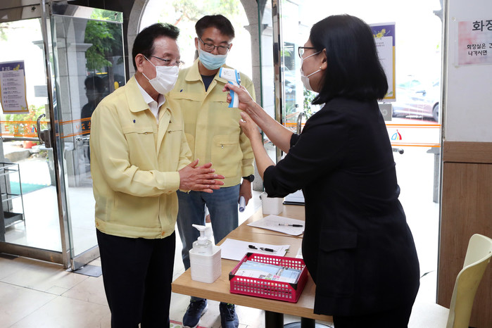 정순균 강남구청장이 최근 종교시설 등에서 코로나19 확진자가 발생함에 따라 지난 28일 소규모 종교시설을 점검했다. 사진은 정 구청장(왼쪽)이 지역내 교회를 방문해 마스크 착용, 발열 체크, 손소독제 비치 등 감염병 예방수칙 준수 여부를 점검하고 있는 모습. (사진제공=강남구청)