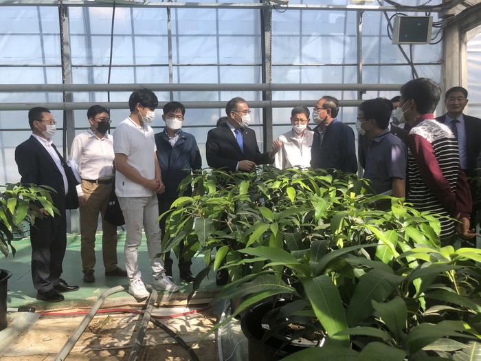 국회 농림축산식품해양수산위원회 이개호 위원장과 신임 허태웅 농촌진흥청장은 지난 25일 영광군 내 모시 가공업체인 모시올과 아열대 재배 농가 망고야 농장을 방문하여 농업 현안을 청취하고 추석을 맞이하여 농업인을 격려하였다.