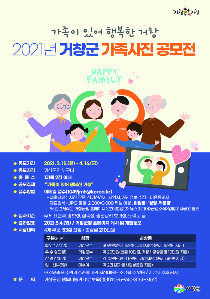 거창군은 가족친화적인 사회분위기 조성 및 저출산 극복을 위한 사회적 공감대 형성을 위해 ‘2021년 거창군 가족사진 공모전’을 개최한다.