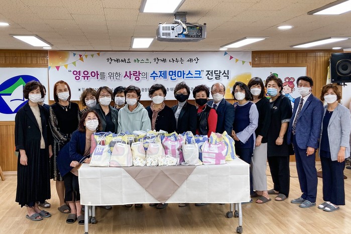 광진구 광장동 자원봉사캠프가 최근 지역내 어린이집 19곳과 유치원 5곳에 총 1500여개의 수제 면마스크를 직접 제작해 전달했다. 사진은 전달식에서 관계자 및 자원봉사자들이 기념촬영을 하고 있는 모습. (사진제공=광진구청)