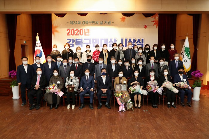 서울 강북구가 최근 이웃사랑을 실천하면서 지역사회 발전을 위해 앞장선 모범구민을 선정하는 ‘2020 강북구민대상’ 7개 분야 수상자들에게 시상했다. 사진은 시상식에서 박겸수 구청장(앞줄 왼쪽에서 다섯 번째)이 수상자들 및 관계자들과 기념촬영을 하고 있는 모습. (사진제공=강북구청)