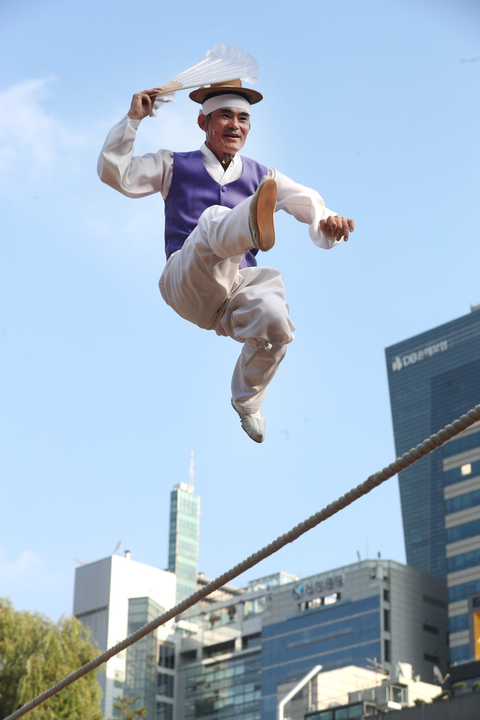 최근 서울 강남구 선정릉 정문에서 주민과 함께하는 부채춤(한국의집 예술단), 강령탈춤(송용태·국가무형문화재 외) 등 다양한 전통민속공연이 펼쳐지는 ‘제5회 선정릉 문화축제’가 개최됐다. 사진은 중요무형문화재3호 남사당놀이 이수자인 권원태 명인의 줄타기 공연 진행 모습.(사진제공=강남구청)