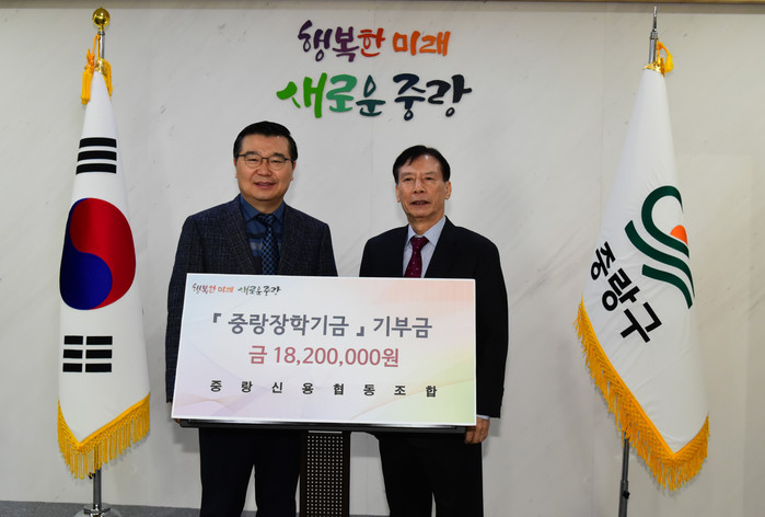 서울 중랑구는 19일 중랑신용협동조합으로부터 ‘중랑장학기금’ 기부금 1800여만원을 전달받았다. 사진은 류경기 구청장(왼쪽)이 이상군 중랑신용협동조합 이사장으로부터 기부금을 전달받고 기념촬영을 하고 있는 모습. (사진제공=중랑구청)
