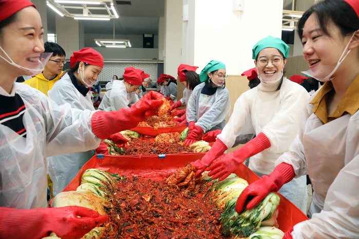 7일 이화여대에서 '사랑의 김장 나누기' 행사가 열려 학생, 교직원, 봉사자들이 어려운 이웃에게 전달할 김장김치를 만들고 있다.