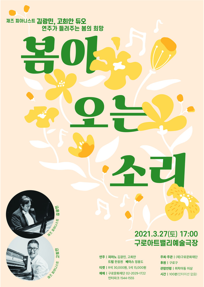 재즈 피아노계의 거장 김광민, 국내 최고의 재즈 피아니스트 고희안의 연주에 더해지는 드러머 한웅원, 베이시스트 정용도의 연주는 더욱 풍성한 사운드로 관객들의 마음을 위로하는 울림이 될 것이며 희망찬 봄기운을 공연장에서 만나볼 수 있는 자리를 제공할 것이다.