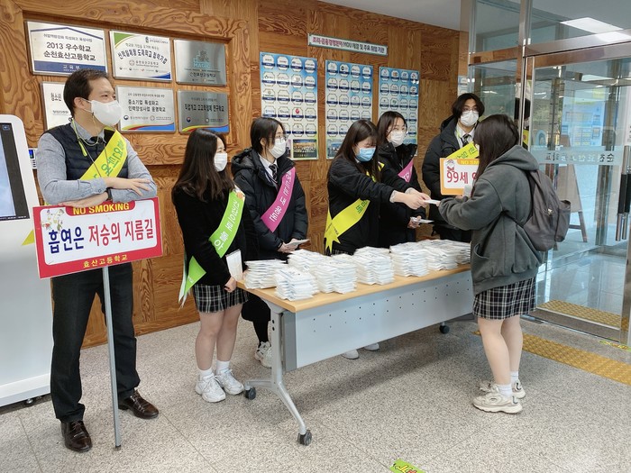 12일 교문 등굣길에서 전남 순천효산고 학생자치회 금연서포터즈(또래예방이) 학생들이 금연 프로젝트 ‘나를 이겨라’라는 금연 캠페인을 전개했다. 사진은 금연서포터즈 학생들이 마스크를 나눠주며 홍보를 하고 있는 모습. (사진제공=전남교육청)