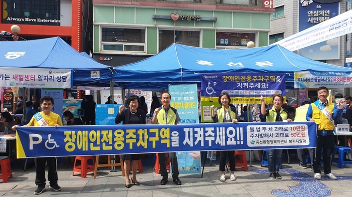 경기 의정부시 흥선동 행정복지센터는 장애인전용주차구역 불법주차 신고가 집중되는 도시형 생활주택, 다중이용시설 등에서 장애인전용주차구역내 불법주차와 주차 방해행위 근절을 위한 집중 계도활동을 펼치고 있다. 사진은 홍보활동을 하는 모습. (사진제공=의정부시청)