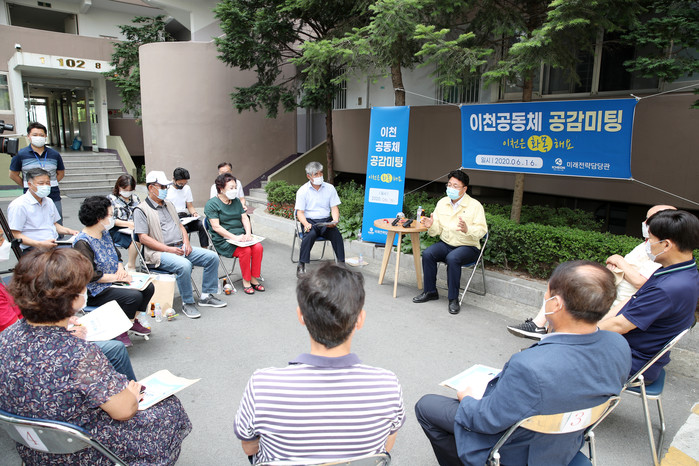 엄태준 경기 이천시장이 16일 안흥3통 일성아파트와 갈산11통 휴먼시아아파트 주민들과 소규모 공감미팅을 진행했다. 이날 엄 시장은 오전에는 일성아파트를, 오후에는 갈산 휴먼시아 아파트를 차례로 방문해 시민과 대화를 하고 주민여론을 청취했으며, 시민들이 불편한 점을 해결해 나가기 위해 적극 노력할 것을 약속했다. 사진은 엄 시장(가운데)이 발언하는 모습. (사진제공=이천시청)