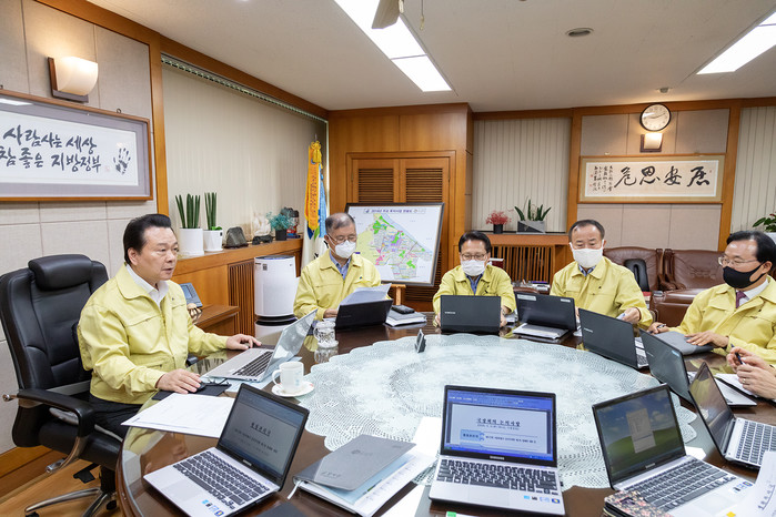 노현송 서울 강서구청장은 지난 11일 각 국장과 소관부서장이 참석한 가운데 ‘장마철 안전대책 회의’를 열었다. 이날 노 구청장은 건설교통국장으로부터 게릴라성 집중호우 대비 관련 보고를 받았다. 사진은 노 구청장(왼쪽)이 회의를 주재하고 있는 모습. (사진제공=강서구청)