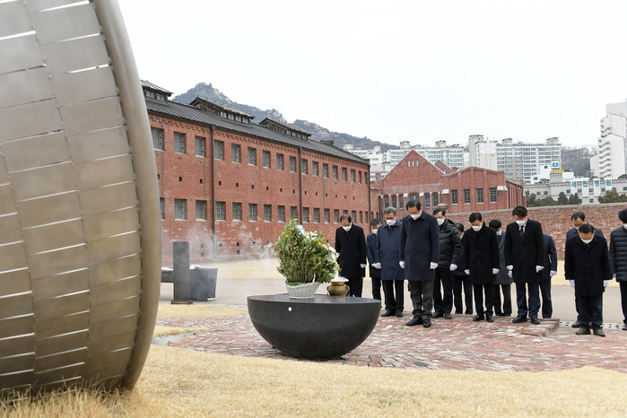 서대문구가 1일 3.1절을 맞이해 서대문형무소역사관에서 순국선열 참배 행사를 했다. 이날 행사는 코로나19로 인해 최소한의 간부 직원들이 참여한 가운데 간소하게 진행됐다. 사진은 문석진 구청장 및 직원들이 추모비 앞에서 묵념하는 모습. (사진제공=서대문구청)