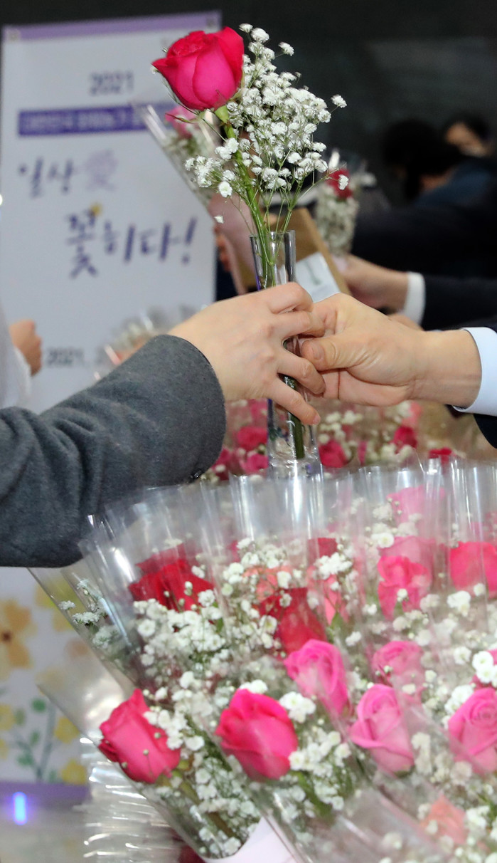 이성희 농협중앙회장 등 임원들이 1일 서울 중구 새문안로 농협중앙회 본관에서 출근하는 직원들에게 꽃을 나눠주고 있다. 농협은 이날 각종 행사의 취소와 연기로 어려움을 겪는 화훼 농가를 돕기 위한 화훼 소비 촉진을 위해 장미꽃 2500송이와 안개꽃 등으로 만든 꽃병 1000개를 임직원에게 나눠줬다.