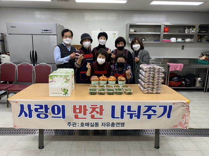 경기 수원시 권선구 호매실동 자유총연맹은 16일 반찬나눔을 위해 한자리에 모였다. 이날 자유총연맹 회장을 포함한 10여명이 호매실동 행정복지센터 조리실에 모여 반찬을 만들고 홀몸노인 5가구에 직접 전달했다. 사진은 참여자들이 기념촬영을 하는 모습. (사진제공=권선구청)