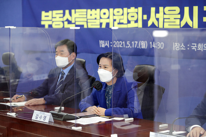 김수영 서울 양천구청장은 지난 5월17일 '더불어민주당 부동산 특위-울시 구청장 긴급 정책현안회의'에 참석했다. 회의에서는 서울시 재건축 아파트 밀집지역 자치구의 재건축 정책 협의 등이 논의됐다. 사진은 정책현안회의에서 김 구청장(오른쪽)이 발표하는 모습. (사진제공=양천구청)