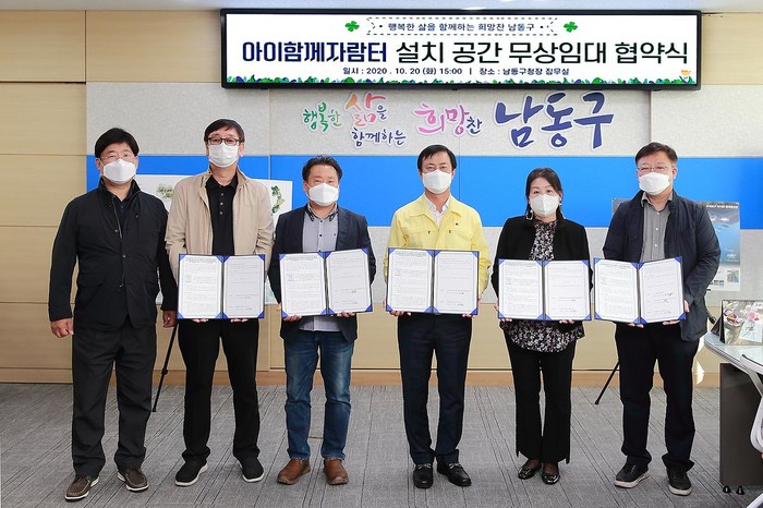 인천 남동구는 지난 20일 초등학생 방과후 돌봄시설인 ‘아이함께자람터’ 설치를 위해 공동주택 4곳의 입주자 대표와 무상임대 협약을 체결했다. 이 협약으로 구는 공동주택 주민공동시설의 일부 공간을 5년간 무상 제공받게 됐다. 사진은 협약식에서 이강호 구청장(오른쪽 세 번째)과 관계자들이 기념촬영을 하는 모습. (사진제공=남동구청)