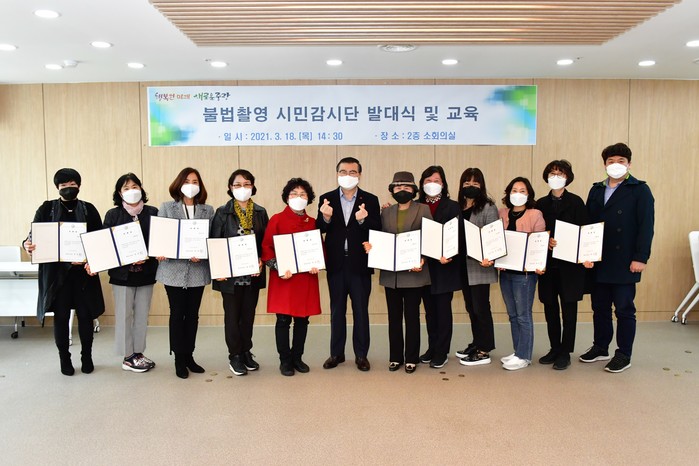 서울 중랑구가 18일 ‘중랑구 불법촬영 시민감시단 발대식’을 개최했다. 시민감시단은 5팀(2인 1조)으로, 구청 등 공중화장실의 불법카메라 설치 여부를 정기적으로 점검하고 불법촬영 예방 캠페인 활동을 수행한다. 사진은 발대식에서 류경기 구청장(왼쪽 여섯 번째)과 시민감시단원들과 기념촬영을 하고 있는 모습. (사진제공=중랑구청)