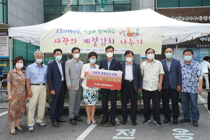 서울 성북구 종암동주민센터 앞에서 최근 새종암새마을금고 주관으로 '사랑의 계절김치 나누기' 행사가 열렸다. 사진은 행사에 참여한 이승로 구청장(왼쪽 여섯 번째)과 관계자들이 함께 기념촬영을 하고 있는 모습. (사진제공=성북구청)