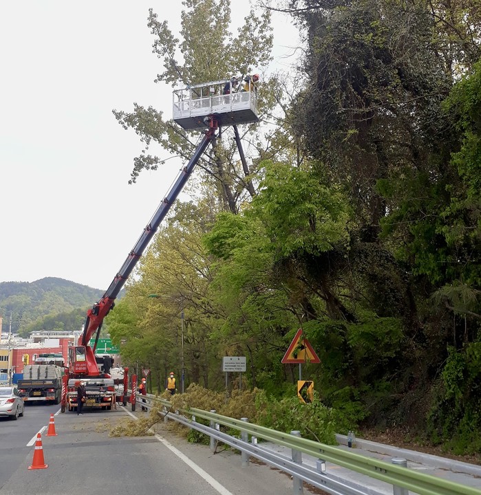 이날 작업에는 숲가꾸기패트롤 작업단인 기간제근로자 7명과 작업차 1대, 경찰 및 관련 공무원 등 20여명의 지원 인력이 투입돼 그동안 주민 요청이 있었던 도로변 재해 위험목을 사전 제거했다.