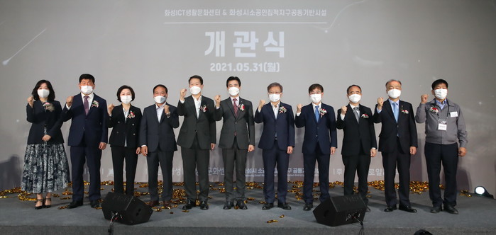 경기 화성시가 31일 '화성 ICT생활문화센터'와 '화성시 소공인 집적지구 공동기반 시설' 개관식을 개최했다. 두 시설은 예술인·창업인들과 소공인들이 협업·융합할 수 있도록 'ACT GROUND'라는 이름으로 한 공간에 조성됐다. 사진은 개관식에서 서철모 시장(가운데)이 관계자들과 기념촬영을 하는 모습. (사진제공=화성시청)