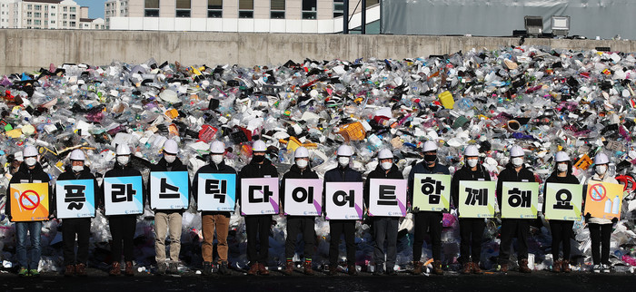 19일 오전 경기 수원시 영통구 수원시자원순환센터에서 수원도시공사 임직원들이 '플라스틱 다이어트 함께해요' 문구가 새겨진 피켓을 들고 탈 플라스틱 캠페인을 하고 있다.