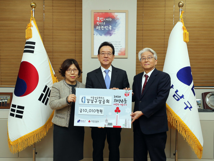 정순균 강남구청장은 11일 구청장실에서 열린 ‘2020 희망온돌 따뜻한 겨울나기 후원금 전달식’에서 강남구상공회로부터 지적·자폐성 장애인들을 위한 후원금을 전달받았다. 사진은 정 구청장(가운데)과 관계자들이 기념촬영을 하는 모습. (사진제공=강남구청)