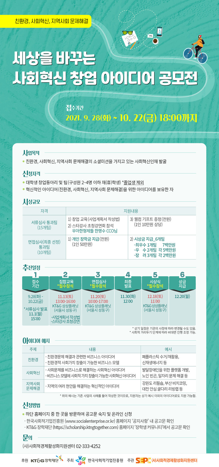 [시민일보 = 홍덕표 기자] KT&G장학재단은 재단이 후원하고 한국사회적기업진흥원이 개최, (사)사회적경제활성화지원센터가 주관하는 '사회혁신 창업 아이디어 공모전'이 열린다고 29일 밝혔다.