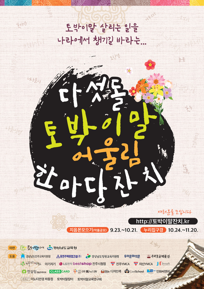 경상남도교육청(교육감 박종훈)과 사단법인 토박이말바라기(으뜸빛 강병환)는 오는 24일 홈페이지를 통해 다섯 돌 토박이말 어울림 한마당 온라인 잔치를 연다.