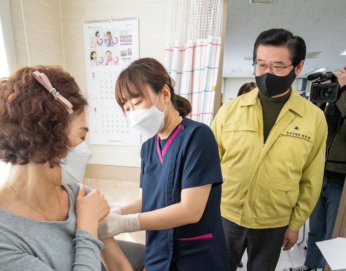 성장현 용산구청장이 지난 9일 코로나19 백신 접종 현장을 살폈다. 이날 접종은 용산구 효창동 소재 연세세림내과의원에서 진행됐으며 구립용산노인전문요양원 종사자 32명이 접종을 마쳤다.사진은 성장현 구청장(오른쪽)이 백신 접종 현장을 살피고 있는 모습. (사진제공=용산구청)