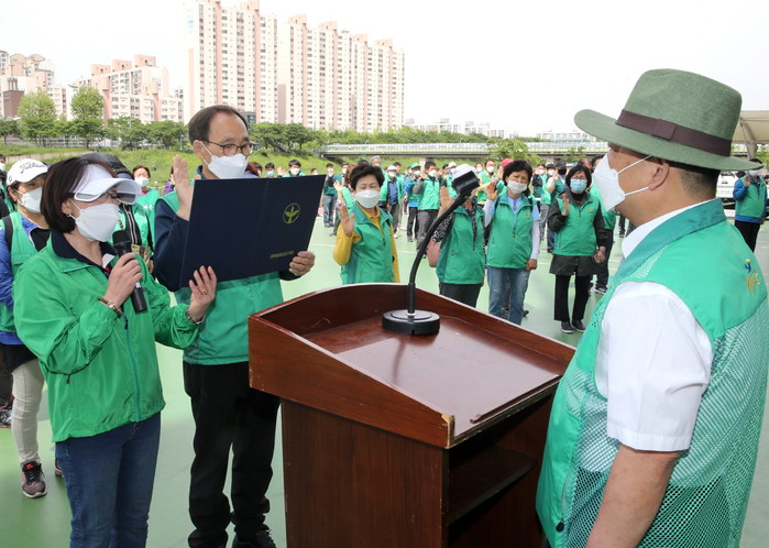금천구는 14일 금천한내 다목적광장에서 새마을지도자금천구협의회 주관으로 주민자율방역단 발대식을 개최했다. 사진은 참석자들이 결의문을 낭독하고 있는 모습. (사진제공=금천구청)