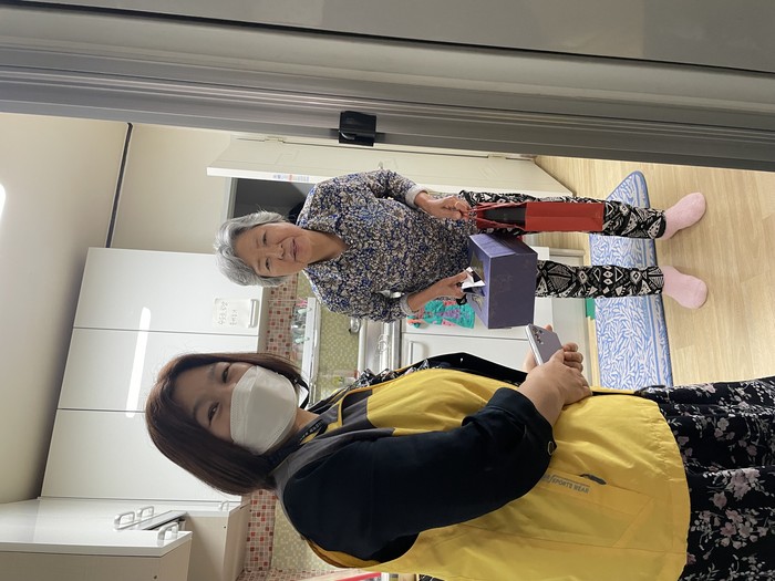 경기 오산시 대원동행정복지센터가 지역사회보장협의체와 12일 찾아가는 '孝나눔 홀몸어르신 생신잔치 및 The 행복한 생일' 행사를 개최, 생일을 맞은 홀몸노인 3가구에 케이크와 건강보조식품을 전달하고, 위탁아동 한 명에게는 케이크와 문화상품권을 전달했다. 사진은 대상가정을 방문해 케이크를 전달하는 모습. (사진제공=오산시청)